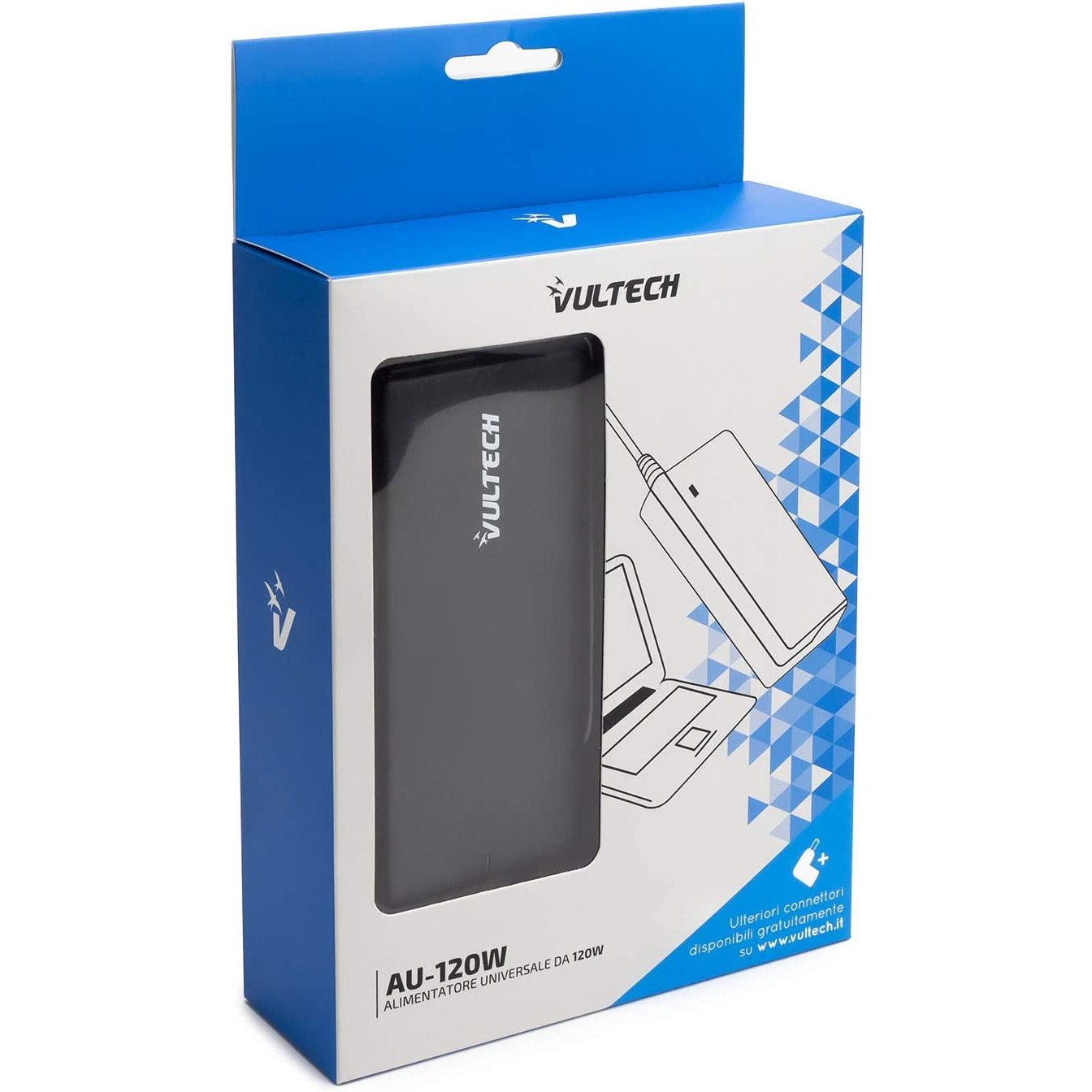 L'alimentatore universale VulTech AU-120W Rev. 2.5 è realizzato per alimentare qualsiasi notebook che necessiti di una potenza di carica massima di 120W. Questo prodotto è autosettante, ovvero in grado di impostare automaticamente il corretto amperaggio e voltaggio per l'alimentazione del notebook. E dotato di 11 connettori intercambiabili in modo da garantire la piena compatibilità con tutti i notebook. In base al tipo di connettore, l'alimentatore imposta la giusta tensione in uscita. In questo modo, il notebook è protetto da tensioni eccessive o non propriamente indicate per esso.