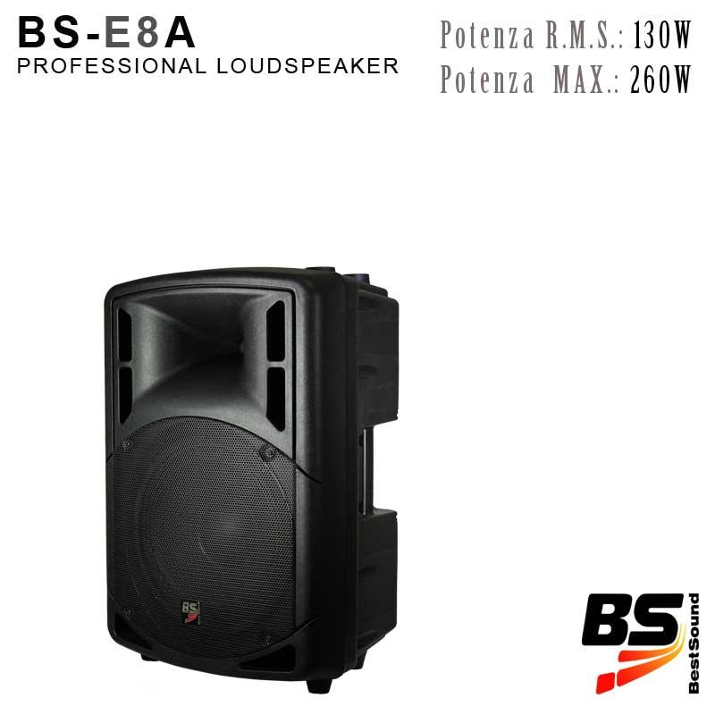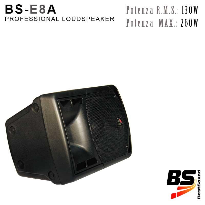 BS-E8A PROFESSIONAL LOUDSPEAKER - Diffusore acustico Amplificato a due vie "Full Range", in grado di generare pressioni massime dell'ordine di ben 124dB, idoneo per applicazioni "Live" e "Disco". Per la sua realizzazione sono stati impiegati materiali di ottima qualità per garantirne il funzionamento nel tempo. Posizionate il diffusore nella posizione desiderata utilizzando le maniglie poste ai laterali. Grazie alla particolare forma, può essere posizionata come cassa monitor anche in orizzontale, senza dover utilizzare staffe aggiuntive. La seconda maniglia ne agevola il posizionamento. La parte frontale presenta un woofer per la riproduzione delle tonalità medio basse e un tweeter preposto alla riproduzione delle tonalità alte. Un piccolo led indica che il diffusore è acceso.