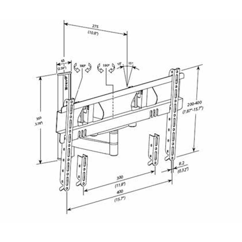 Supporto da parete a 1 bracci studiato per televisori LCD da 40" a 50". Realizzato in alluminio anodizzato satinato, consente l'orientamento dello schermo in verticale con un'inclinazione di circa 15° ed una rotazione di circa 45°. Attacco multiplo per tutti i TV (max 30x40, 40x40). Compatibile con TV serie LED.