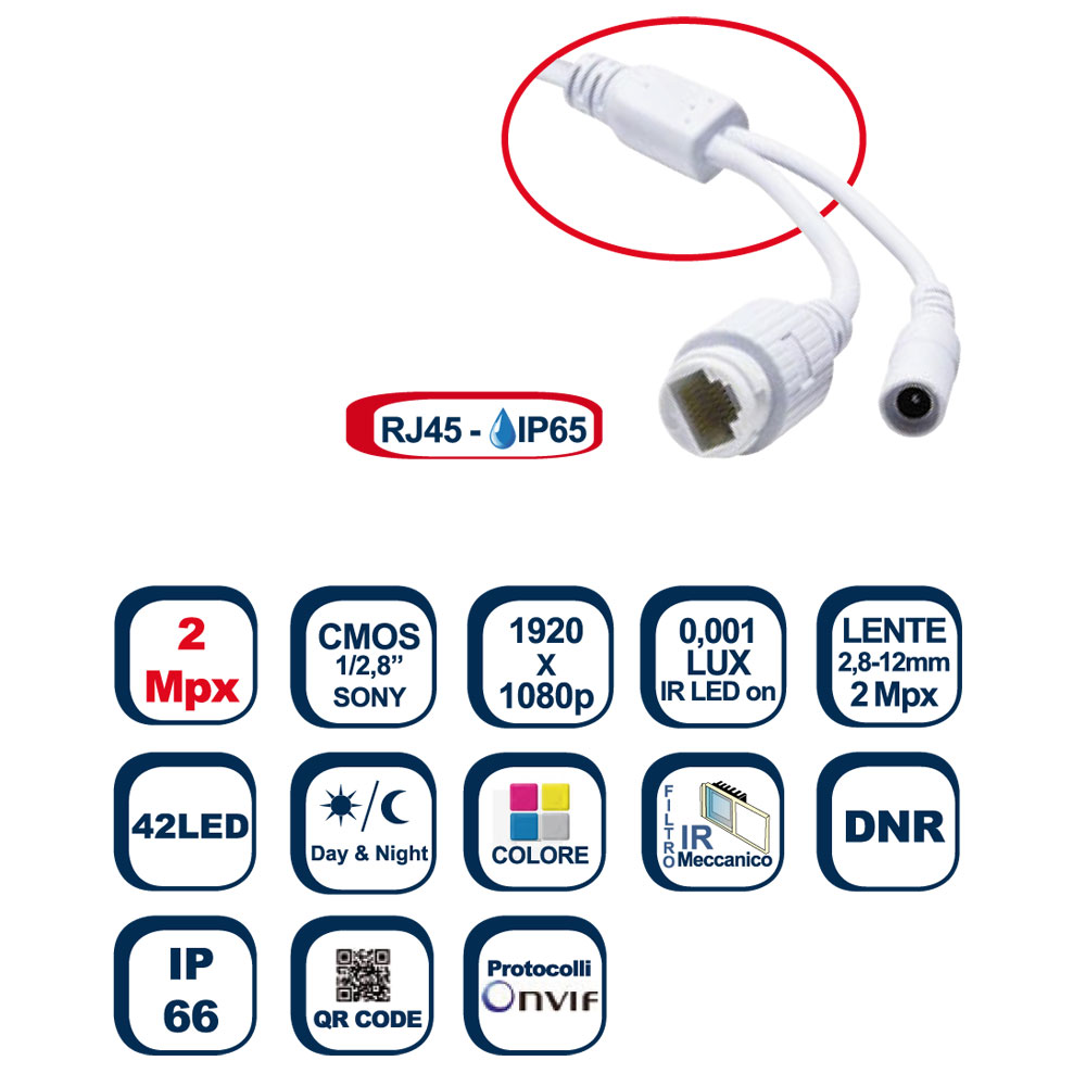 - TELECAMERA BULLET 2Mpx IP 1080P IP66 L.VARIFOCAL 2,8~12mm, ICR, 42LED, CMOS 1/2,8" Sony Exmor IMX222, ONVIF, OSD, COLORE BIANCO