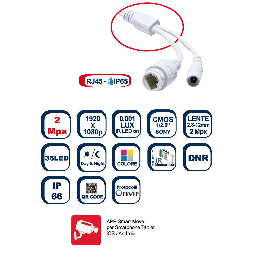 - TELECAMERA DOME 2Mpx IP 1080P IP66 L.VARIFOCAL 2,8~12mm, ICR, 36LED, CMOS 1/2,8" Sony Exmor IMX222, ONVIF, OSD, COLORE BIANCO