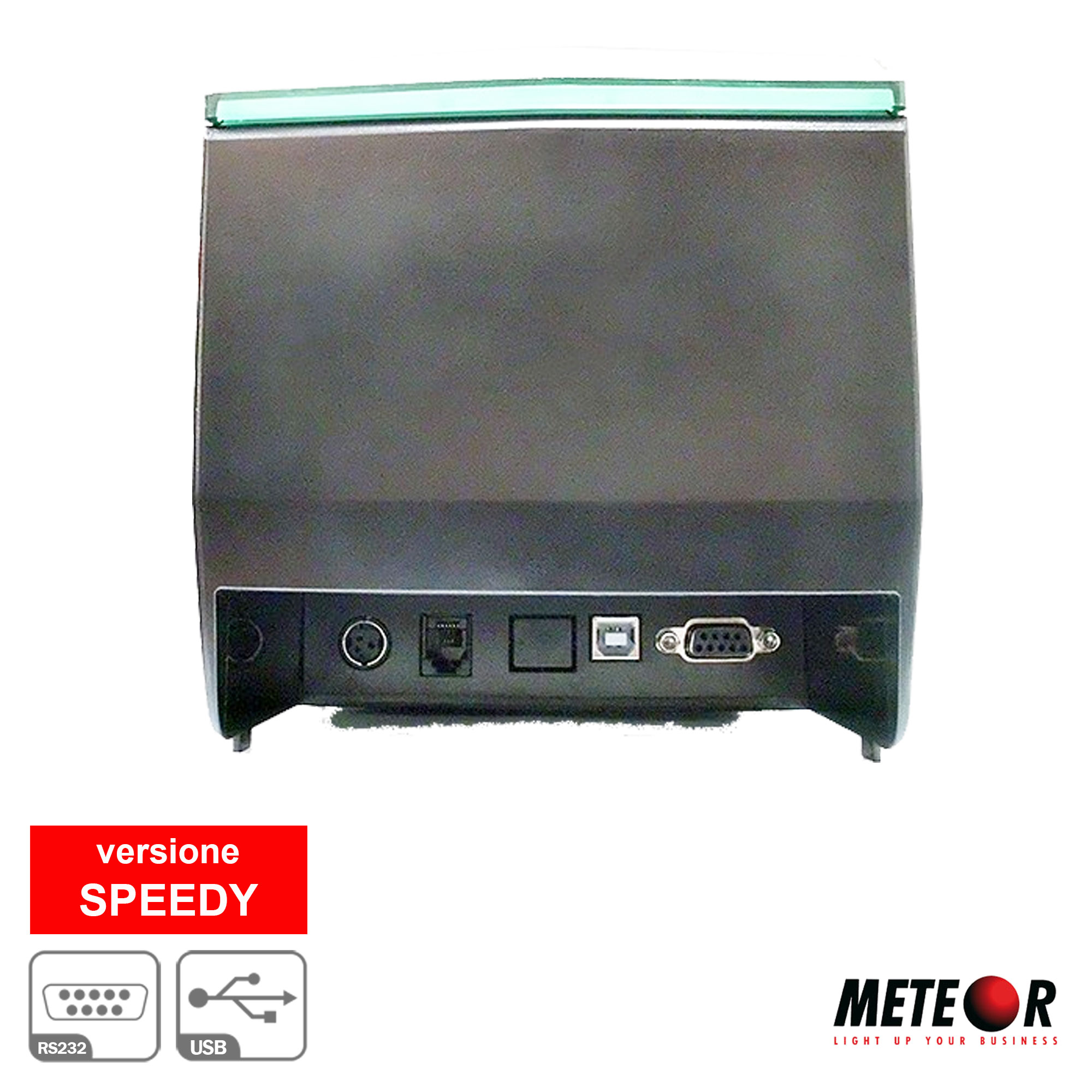 Perche' scegliere una stampante termica SPEEDY della Meteor? Innanzitutto la Meteor e' leader nel settore dell'identificazione automatica, lettori barcode e stampanti di etichette sia desktop sia di tipo industriale. Acquistare un suo prodotto e' sinonimo di affidabilita' e qualita'. Uno dei prodotti piu' gettonati e' la nuovissima mini stampante termica Meteor di tipo desktop SPEEDY, la quale offre elevata velocita' di stampa e praticita' di utilizzo per la stampa di scontrini, ricevute e ordinazioni. Le ridotte dimensioni e il design moderno la rendono facilmente collocabile all' interno dei punti vendita dove l' esigenza di spazio e' prioritaria. La praticita' di utilizzo e' garantita dall'alimentatore incluso dalle dimensioni ridotte e dalla facilita' di sostituzione della carta, e' sufficiente aprire il coperchio della stampante, estrarre il rotolo esaurito e inserirne uno nuovo. Con la taglierina automatica a corredo, e' sempre possibile emettere scontrini e ricevute della misura desiderata. La SPEEDY e' quasi l'unica nel suo genere ad avere la funzione BlackMark per il riconoscimento della tacca nera sul retro dei rotoli termici e per il funzionamento con i sistemi operativi Android.