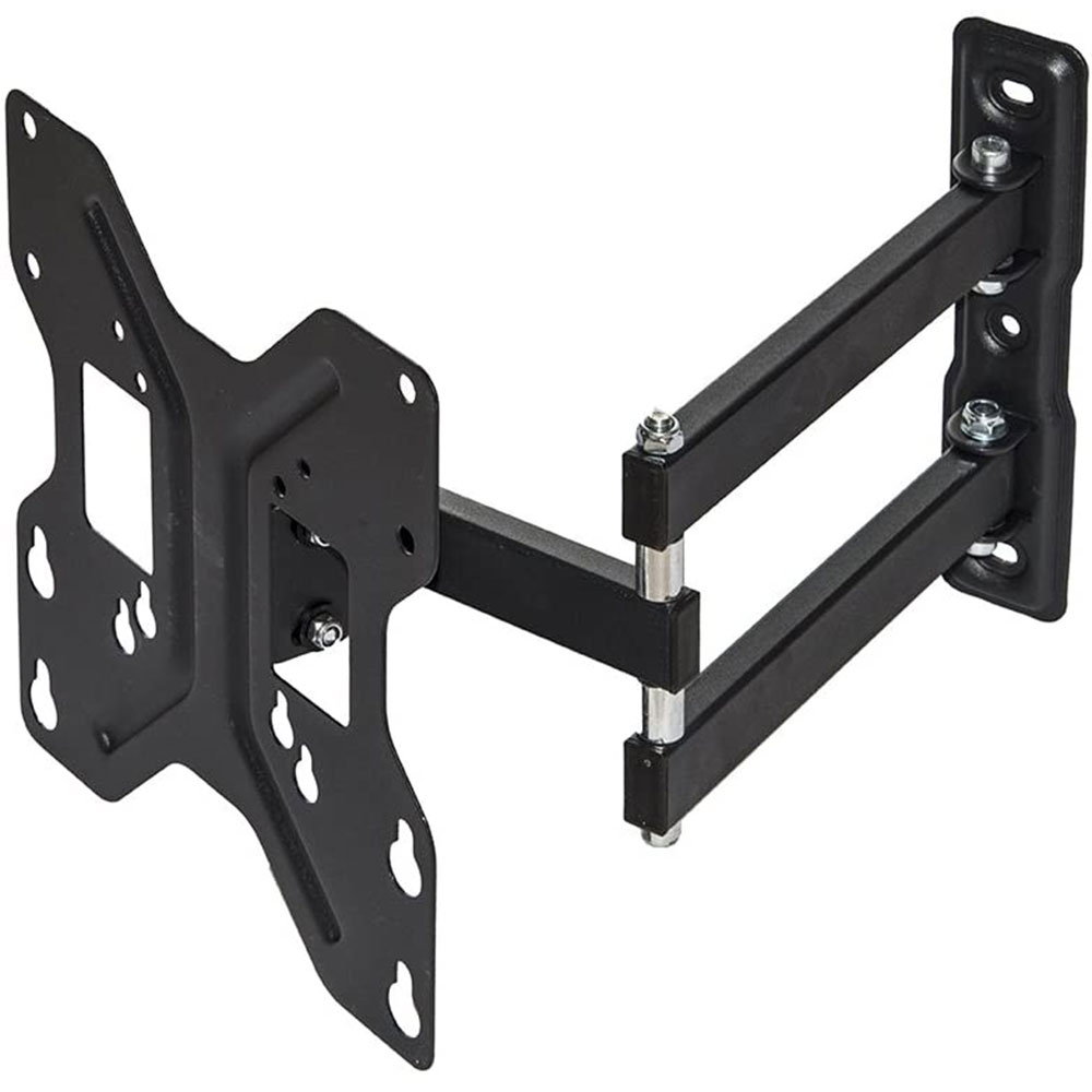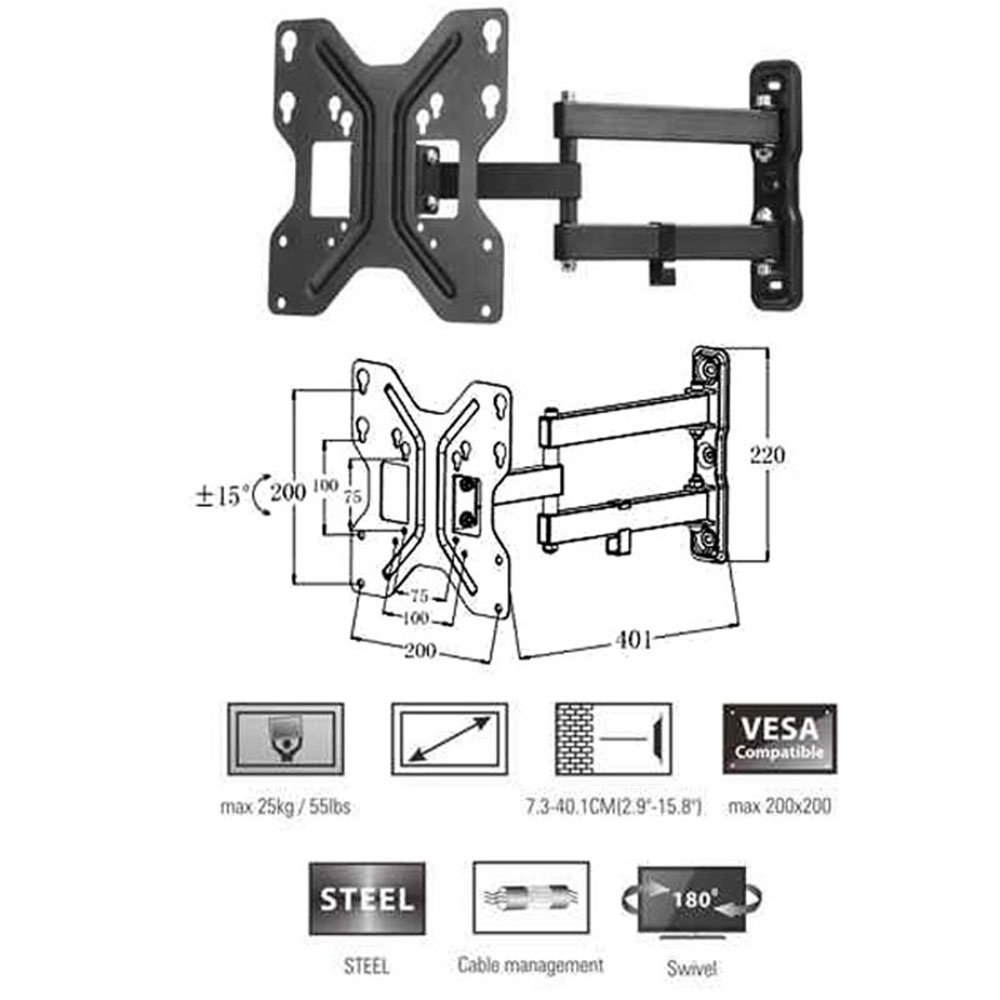 Staffa per montaggio di TV e monitor piatti LED e LCD da 13 a 43 pollici, con un peso fino a 25 kg. I suoi 3 snodi permettono la massima flessibilità nel posizionamento del video, con un'inclinazione alto/basso da +15° a -15° e la rotazione laterale di 180° dell'ultimo snodo. Per standard VESA 75x75, 100x100, 100x200, 200x200 Sporge dal muro da 7,3 a 40 cm quando è completamente esteso. Viti, tasselli, attrezzi, e gancio guidacavi inclusi.