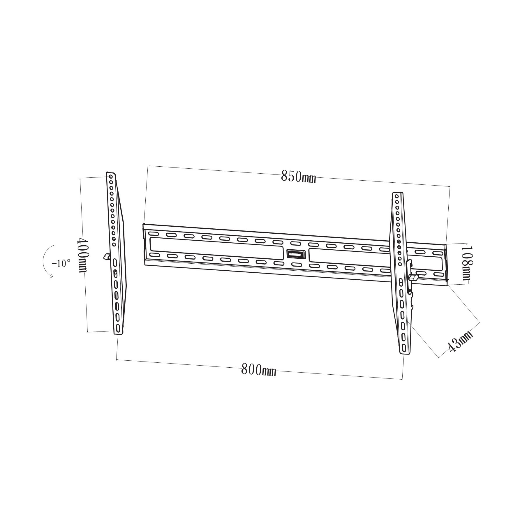 Staffa per installare a parete monitor e TV LED o LCD da 37" a 72", con possibilità di regolare l'angolo di visione verticale. In acciaio, molto robusta, supporta un peso fino a 55 kg. Per schermi standard VESA 75x75, 100x100, 200x200 400x400, 600x400, 800X400 Si può regolare in verticale -10° per posizionare il monitor nella posizione desiderata: Le viti e i tasselli per l’installazione sono inclusi, l'nstallazione è semplice. Profilo molto basso, 4,3 cm, sporge pochissimo dal muro pur mantendo la corretta aerazione nella parte posteriore della TV