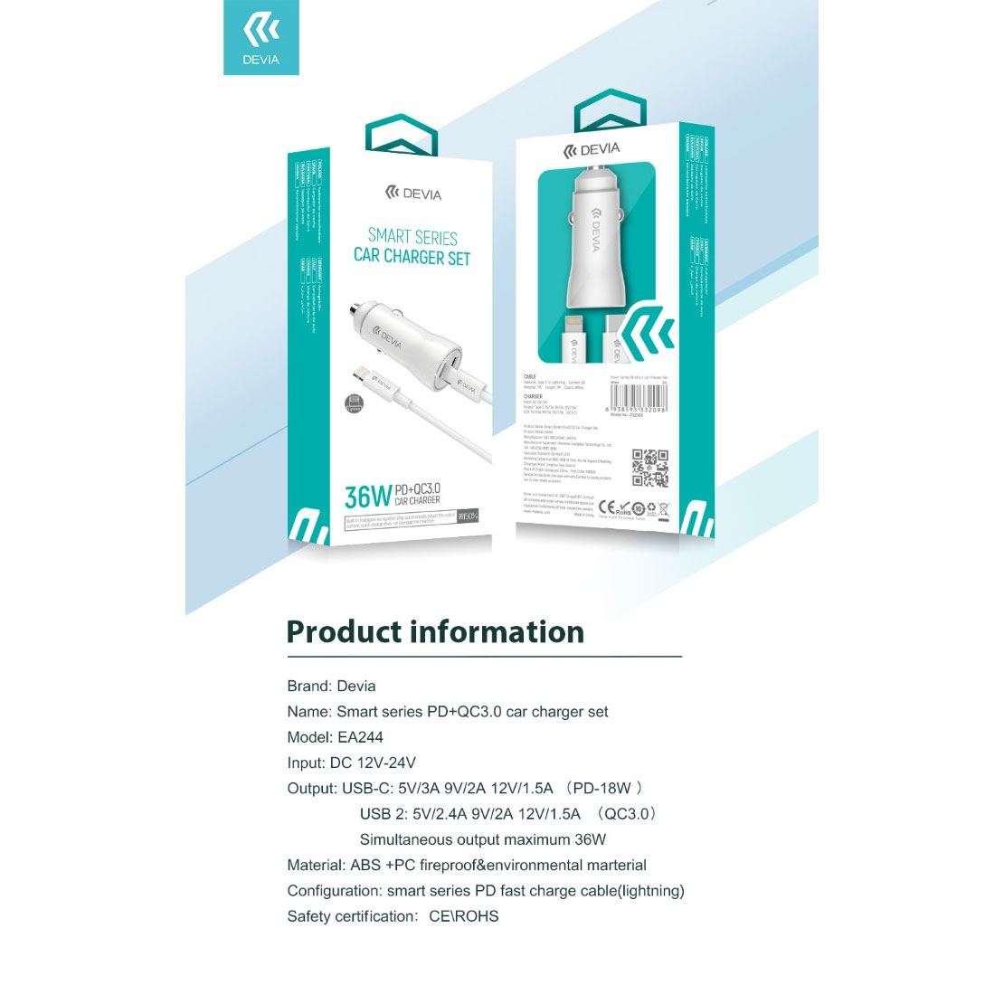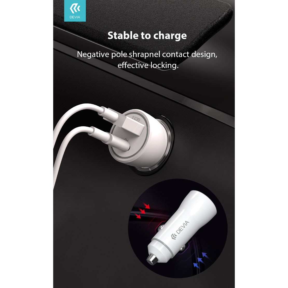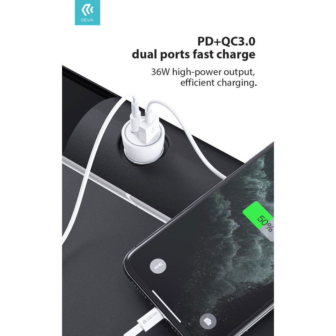 Il caricabatterie DEVIA compatto da auto PD+QC3 Carica rapida 5V-36W con cavo USB Type-C / Lightning per Apple iOS 10 e Superiori, staccabile e utilizzabile come cavo dati. La soluzione due in uno compatta. conforme al protocollo ENERGY STAR, che garantisce il minimo consumo energetico in stand-by.