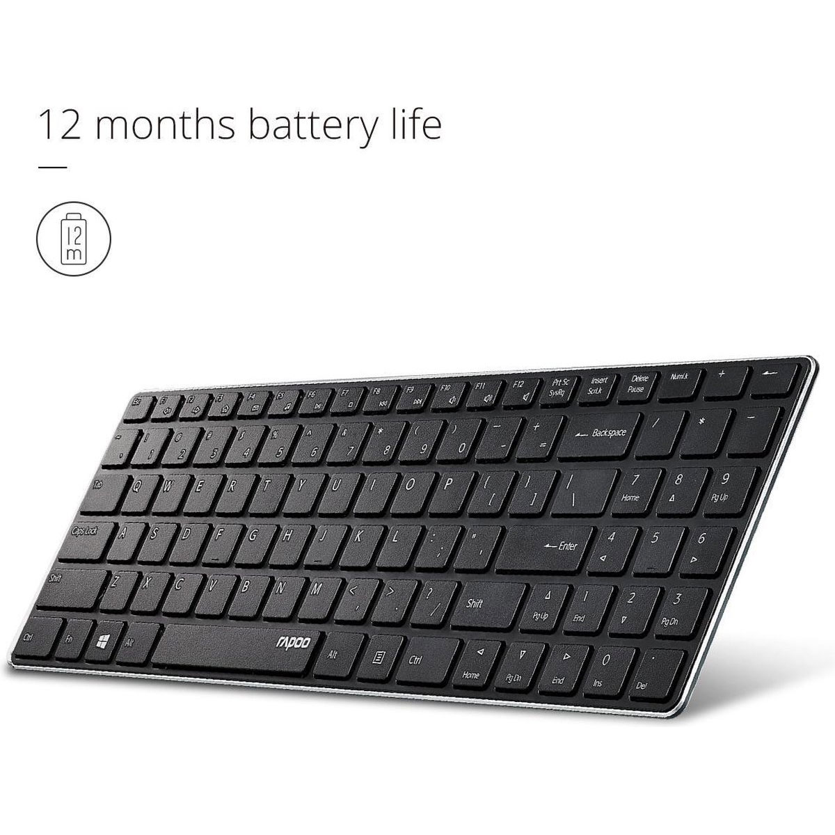 Durata batteria fino a 12 mesi Basso consumo energetico: Le tecnologie Rapoo a risparmio energetico, combinate alla commutazione on/off, consentono di utilizzare ininterrottamente la tastiera per 24 mesi.
