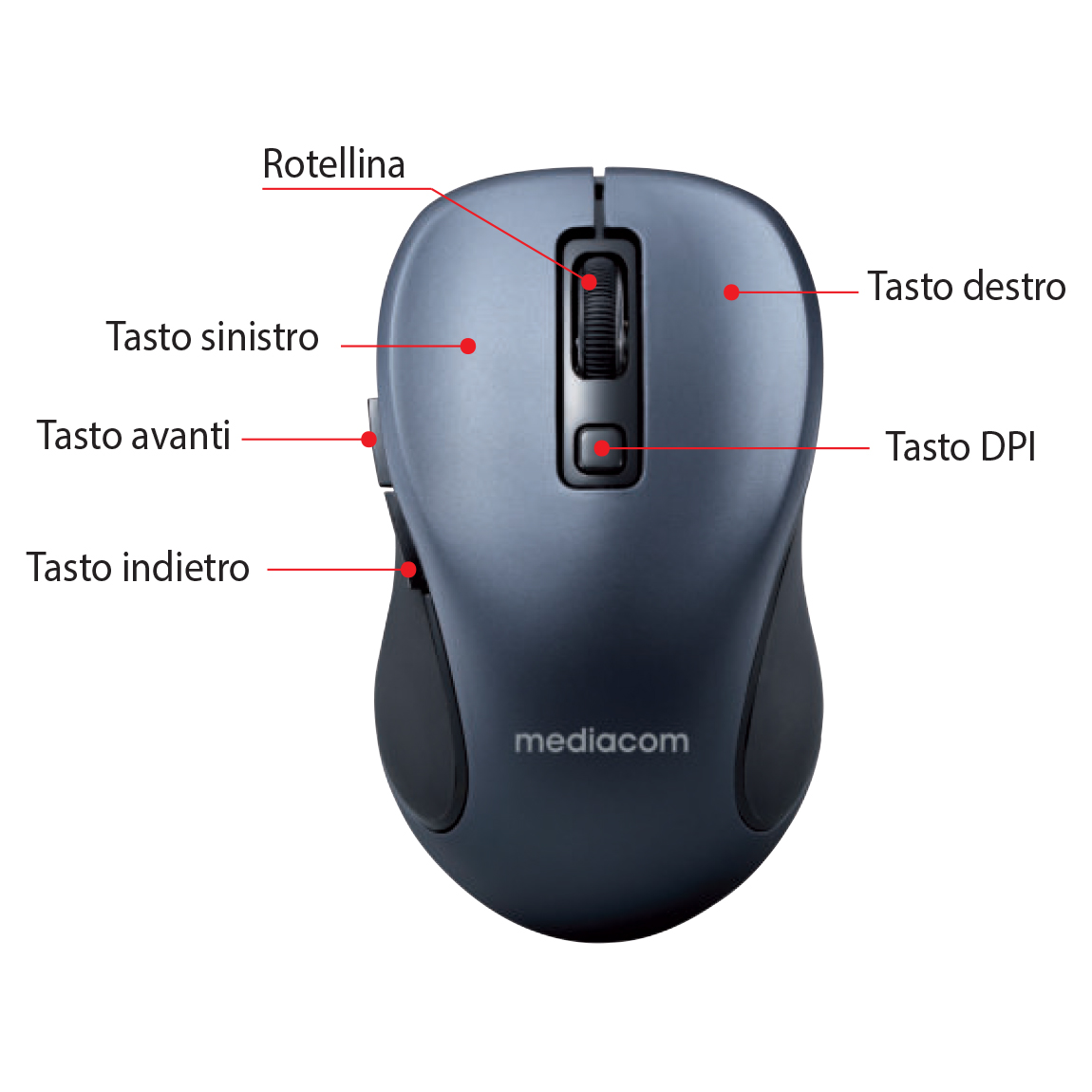 - MOUSE MEDIACOM AX910 6 TASTI OTTICO 1600 dpi BLUETOOTH 4.0 COLORE GRIGIO SCURO