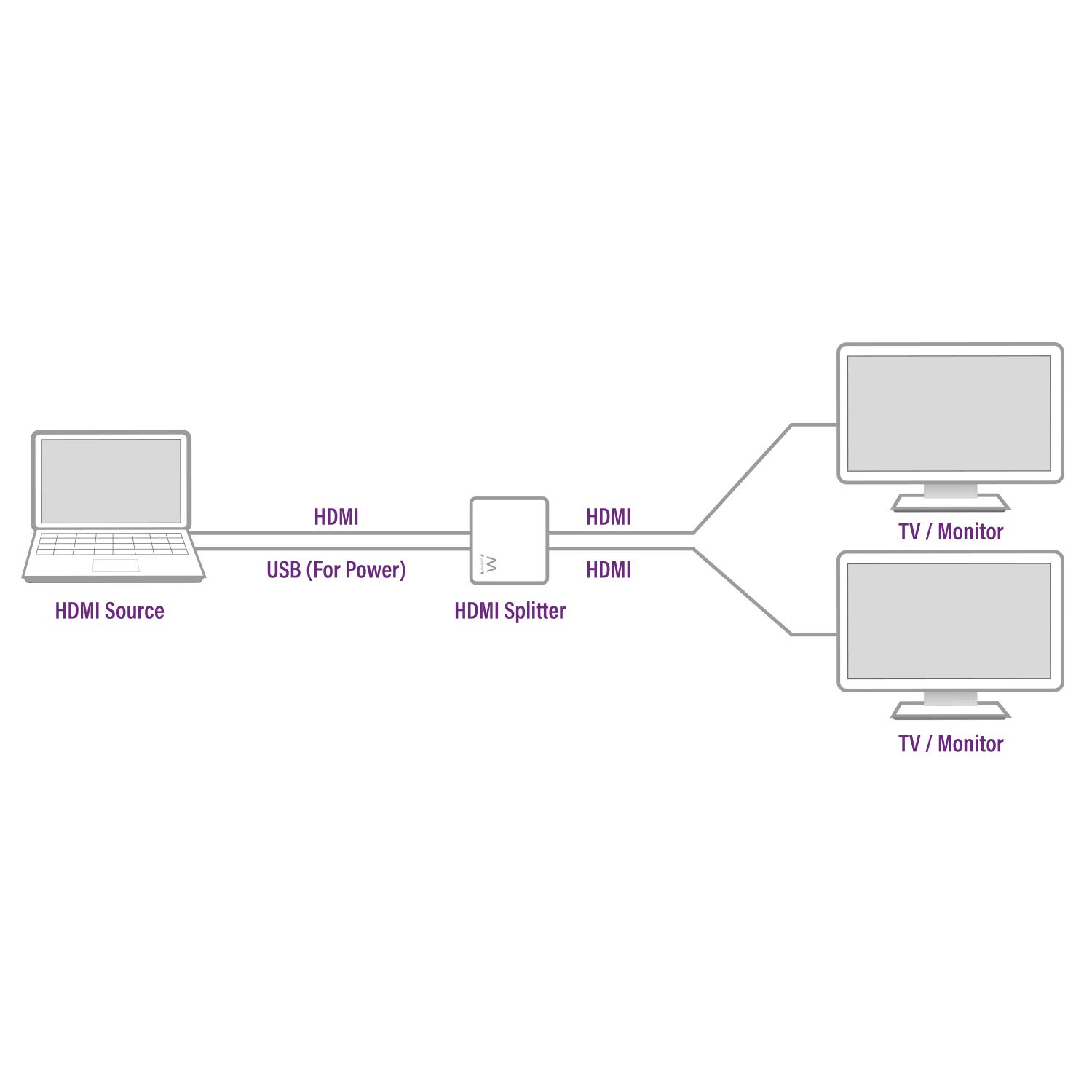Lo splitter HDMI 4K EW3720 divide un singolo segnale HDMI su due TV/schermi separati. Collega EW3720 con un cavo HDMI ad alta velocità con una risoluzione massima 4K di 3840x2160 x 30 Hz e una risoluzione (3D) 1080p a 60 Hz. EW3720 è dotato di cavo di alimentazione USB. Visualizza 1 sorgente video su fino a 2 televisori EW3720 è dotato di un ingresso HDMI e due uscite HDMI per visualizzare video su più schermi. Lo splitter divide la sorgente video su 2 schermi destinazione con una distanza massima di 5 metri senza compromettere la qualità video. EW3720 dispone di spia di LED di alimentazione e stato rossi e verdi. Collegamento dei dispositivi Collega lo splitter EW3720 con un cavo HDMI ad alta velocità alla sorgente. Collega fino a 2 televisori/monitor con un cavo HDMI ad alta velocità alle uscite HDMI su EW3720.