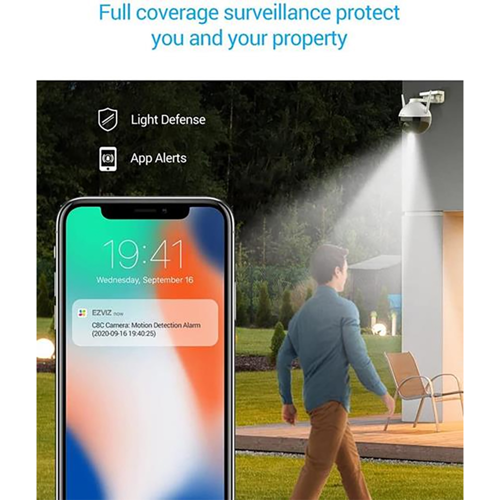 - Inizia una buona giornata con una buona visione. L ambiente circostante è completamente sorvegliato con questa telecamera a brandeggio per esterni. Grazie alla rotazione orizzontale a 352° e alla rotazione verticale a 95°, la telecamera C8C garantisce una ripresa panoramica di tutto ciò che ti circonda. E l'app EZVIZ te la mette a disposizione direttamente sul tuo smartphone o sul tuo dispositivo mobile.