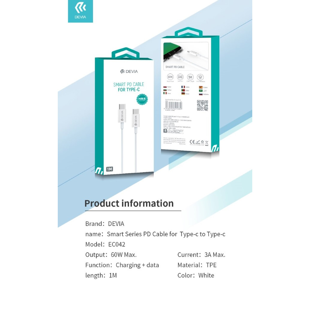 DEVIA DECATC380W è il cavo super rapido da connettore Tipo-C / Type-C. Lunghezza 1.2 metri, 3A. Questo cavo a carica rapida PD 60w Tipo-C / Type-C , collega il tuo dispositivo con connettore Tipo-C alla porta Tipo-C del tuo computer per ricaricare e sincronizzare il dispositivo, oppure all'alimentatore USB.
