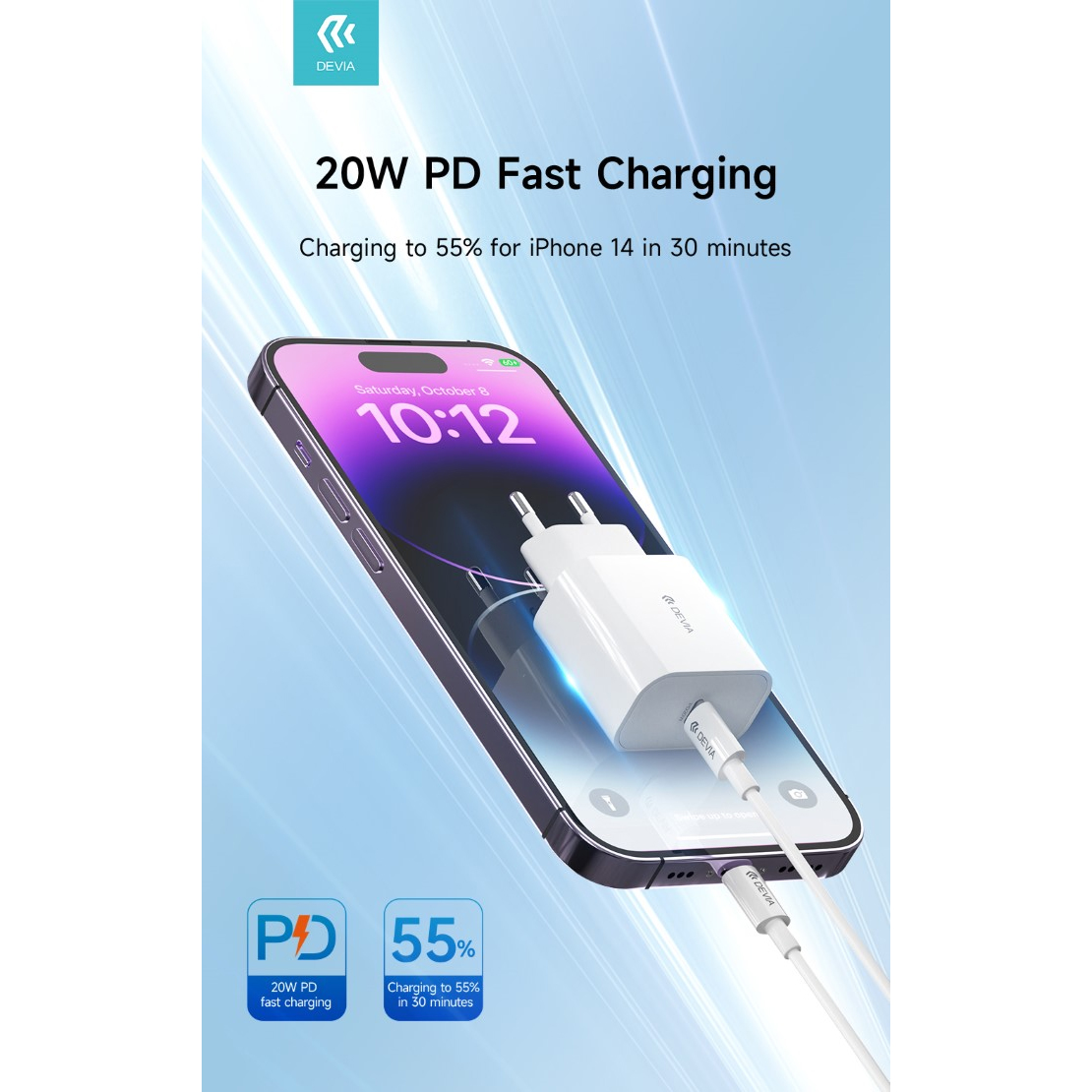 Il caricabatterie rapido PD QUICK 20Watt verione 2 DEVIA compatto da rete con presa Tipo-C e cavo USB " Tipo-C ad Apple Lightning " staccabile e utilizzabile come cavo dati. La soluzione due in uno compatta. conforme al protocollo ENERGY STAR, che garantisce il minimo consumo energetico in stand-by.