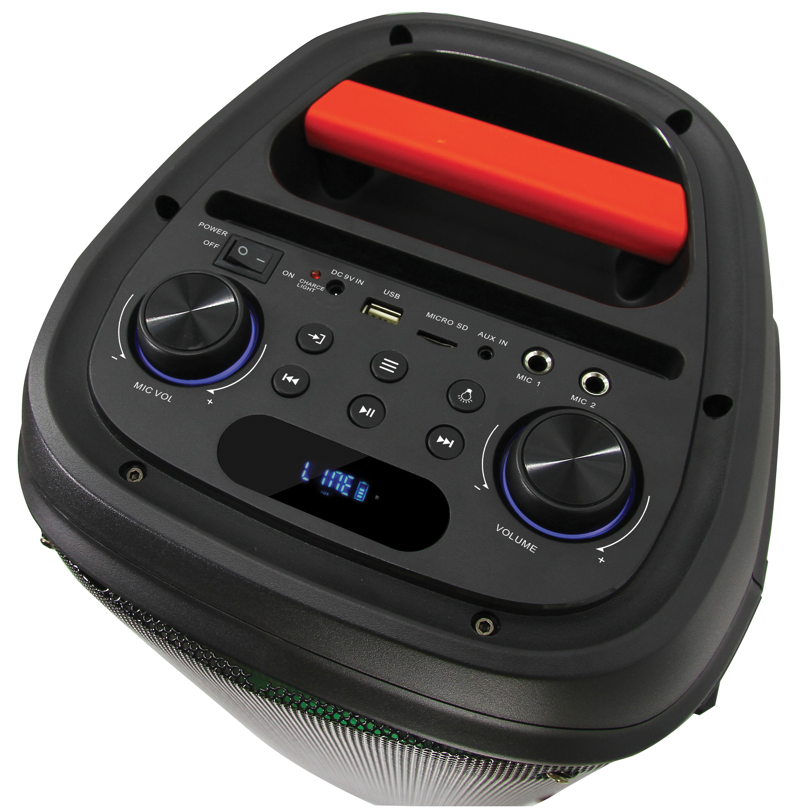 - Grazie alla maniglia posta sul retro puoi trasportare il PartySpeaker dove vuoi tu. - Connessione Bluetooth: ascolta la tua musica attraverso la tecnologia bluetooth da qualsiasi dispositivo. - Porta USB / micro SD: riproduci i tuoi file MP3 da schede micro SD o pen drive USB. - Batteria ricaricabile inclusa (fino a 5 ore di autonomia). Porta la tua musica ovunque grazie alla maniglia. - Doppio Microfono/AUX IN: collega direttamente due microfoni e attraverso l'ingresso AUX IN puoi collegare qualsiasi dispositivo dotato di uscita audio.
