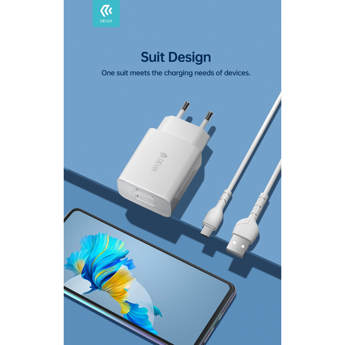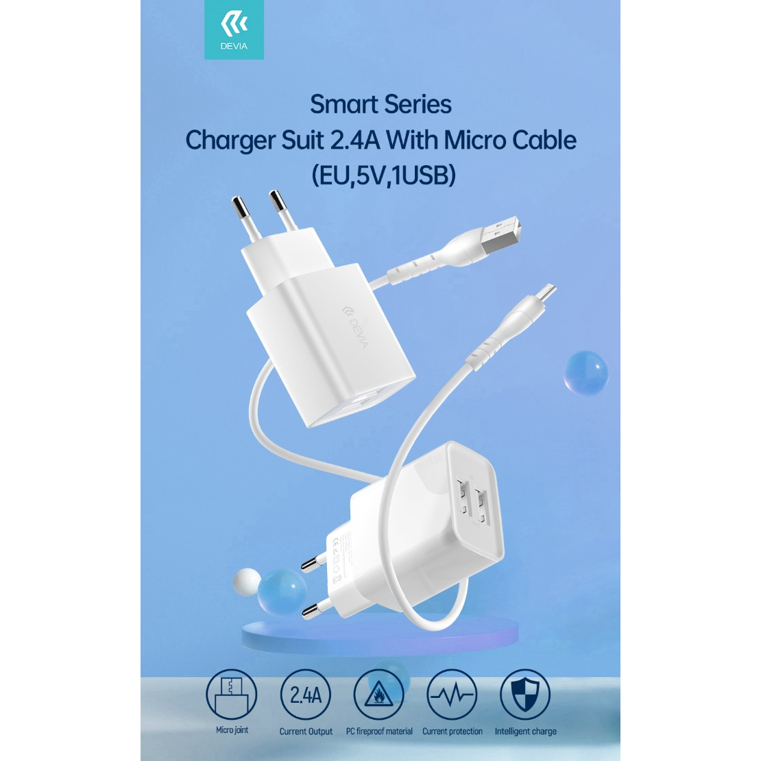 - KIT DEVIA DESC21A020W CARICABATTERIE 2.4A (12W) FAST CHARGE 2USB + CAVO DATI 1MT ANDROID "Micro USB" COLORE BIANCO