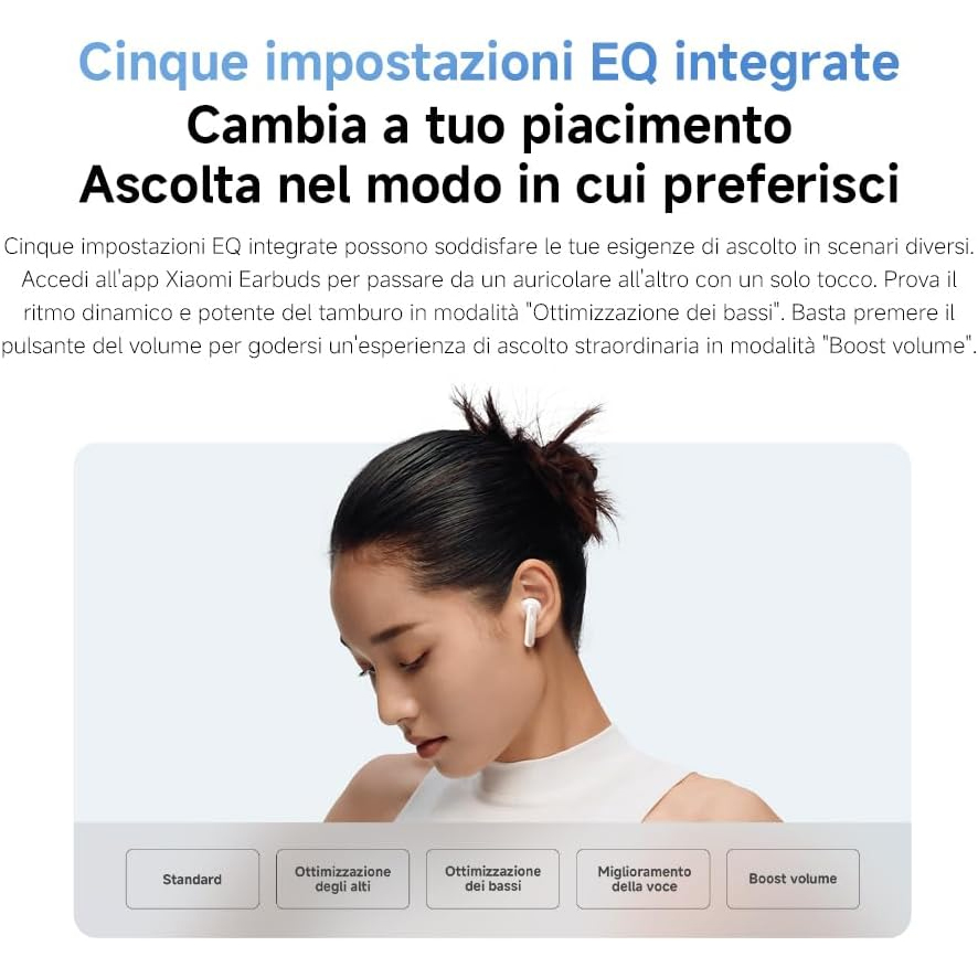 - Ampio driver dinamico da 14,2 mm per un audio potente e a bassa distorsione - Doppio microfono con riduzione del rumore per una ottima chiarezza della voce - Fino a 30 ore di durata della batteria con custodia di ricarica; cancellazione del rumore del vento fino a 4 m/s per le chiamate; cinque impostazioni EQ tramite l'app Xiaomi Earbuds per varie esigenze di ascolto